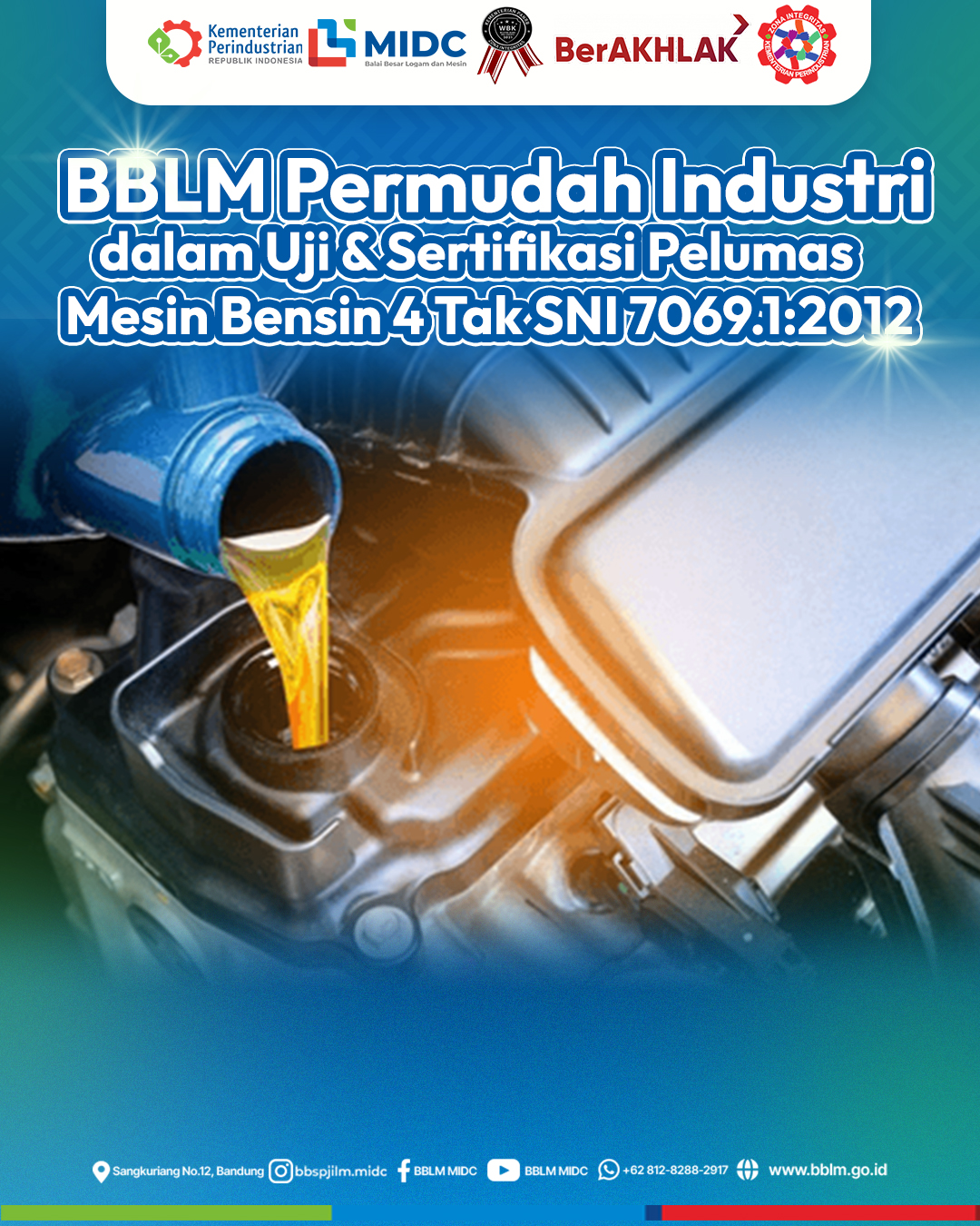 Balai Besar Logam dan Mesin (BBLM) Kementerian Perindustrian memperkuat perannya sebagai Lembaga Sertifikasi Produk (LSPro) resmi. Melalui layanan Uji dan Sertifikasi Pelumas Mesin Bensin 4 Tak SNI 7069.1:2012 di BBLM, lembaga ini hadir untuk mendukung mutu, keamanan, dan daya saing industri pelumas otomotif nasional. Dengan demikian, pelaku usaha dapat memastikan produknya sesuai regulasi dan kebutuhan teknologi mesin modern.
